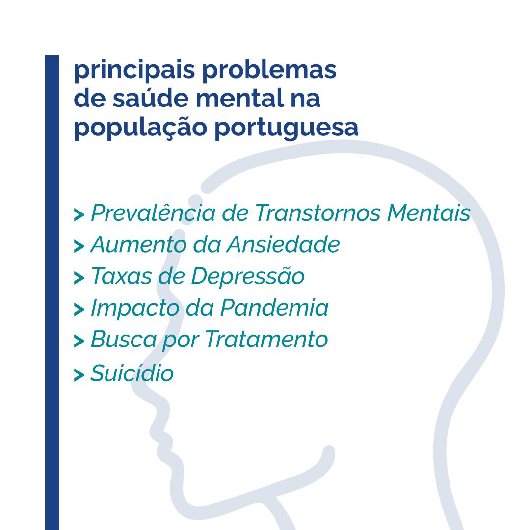 - Cerca de 20% da população portuguesa sofre de algum transtorno mental ao longo da vida, sendo a ansiedade e a depressão os mais comuns.