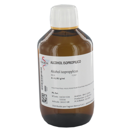 Frasco âmbar de álcool isopropílico com rótulo branco e tampa branca