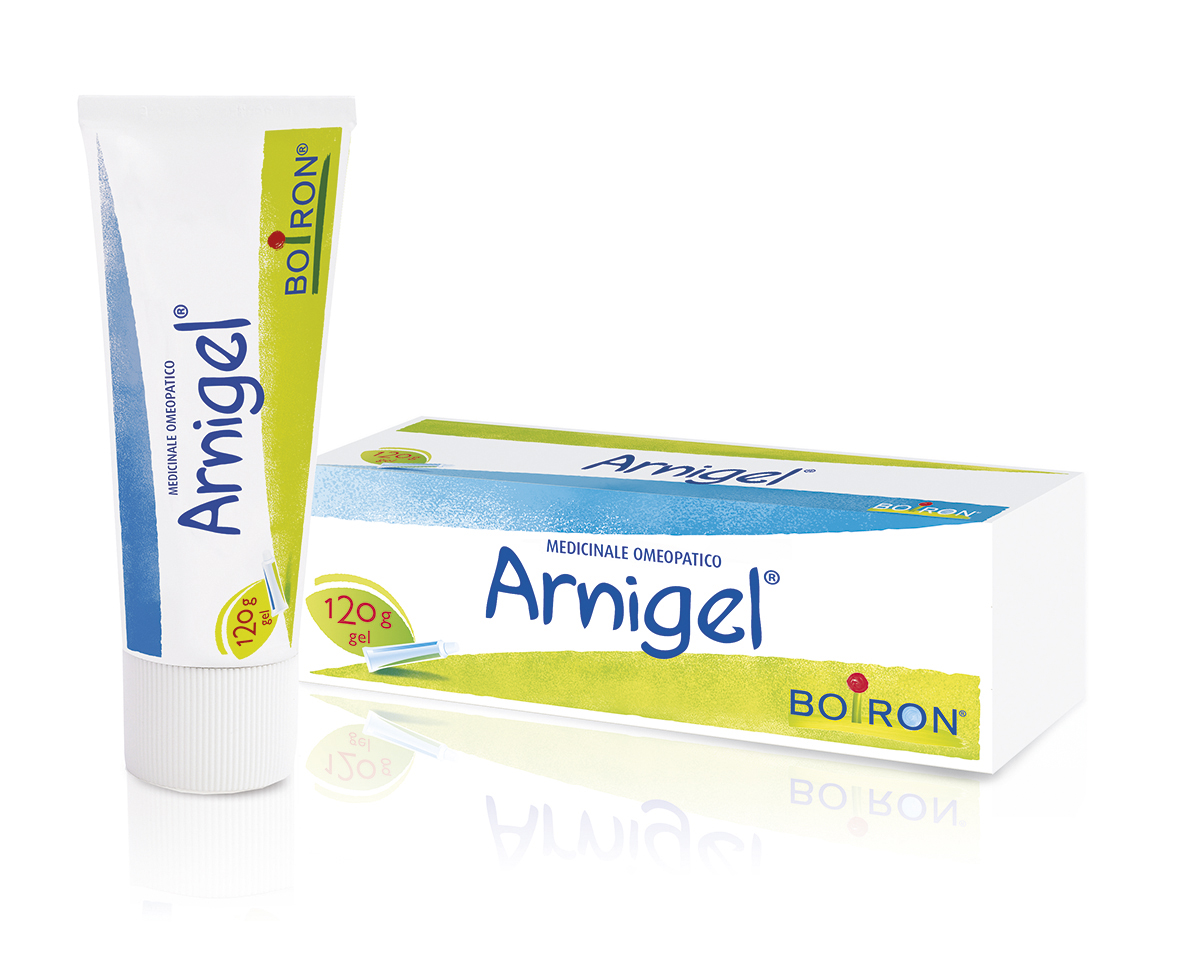 Gel Arnigel Boiron em tubo branco com embalagem caixa azul, branca e amarela