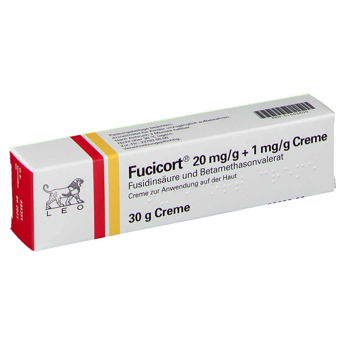 Caixa branca de creme Fucicort com logótipo LEO e texto em alemão
