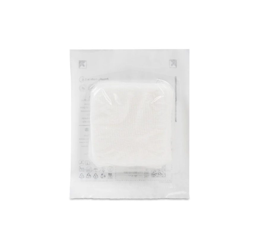 Compressas de Gaze 8 camadas 17 fios, esterilizadas, pacotes de 1 ou 5 unidades, embalagem de 100 pacotes.