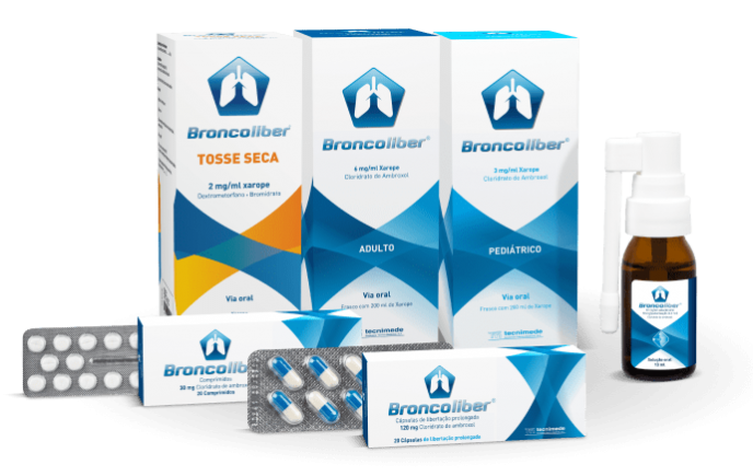 Medicamentos Broncoliber em embalagens brancas e azuis com comprimidos, cápsulas e spray