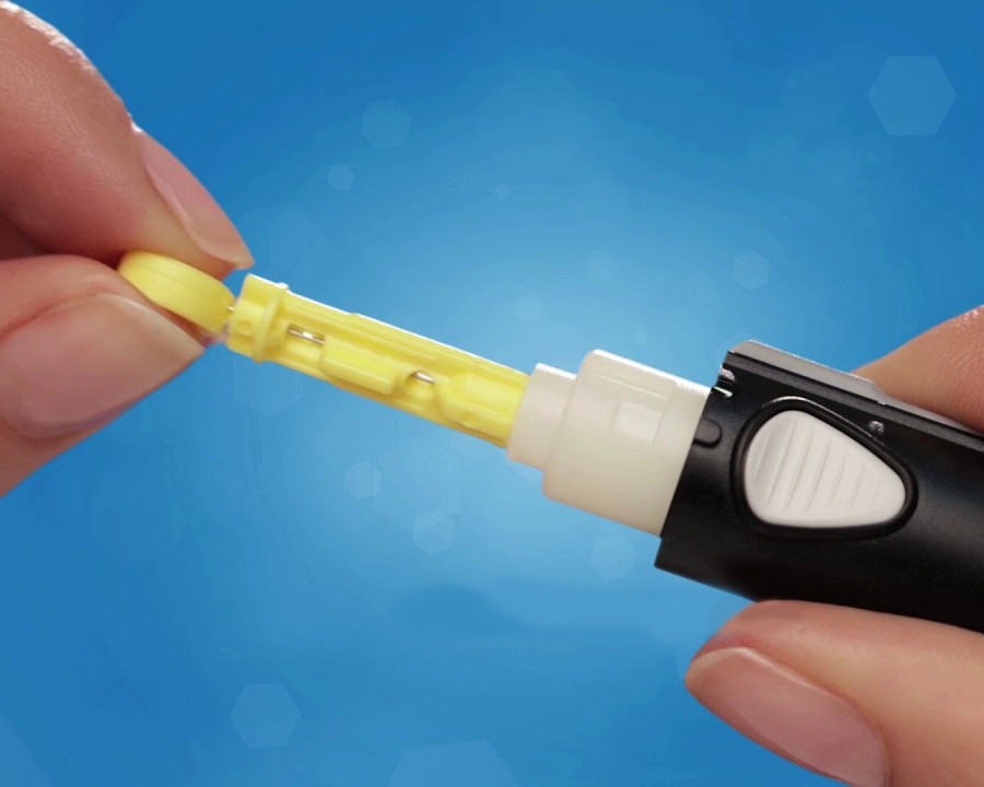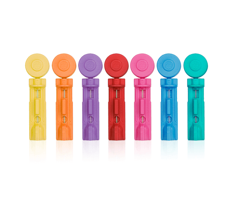 Lancetas coloridas descartáveis indicadas para a colheita de sangue capilar por punção nos dedos.