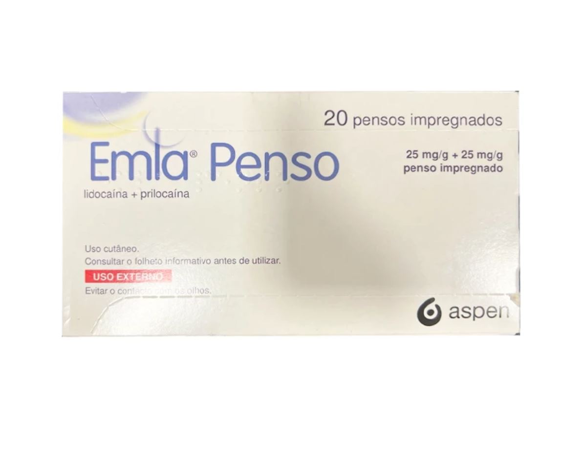 Embalagem branca de medicamento Emla Penso com texto em português e logo da aspen.