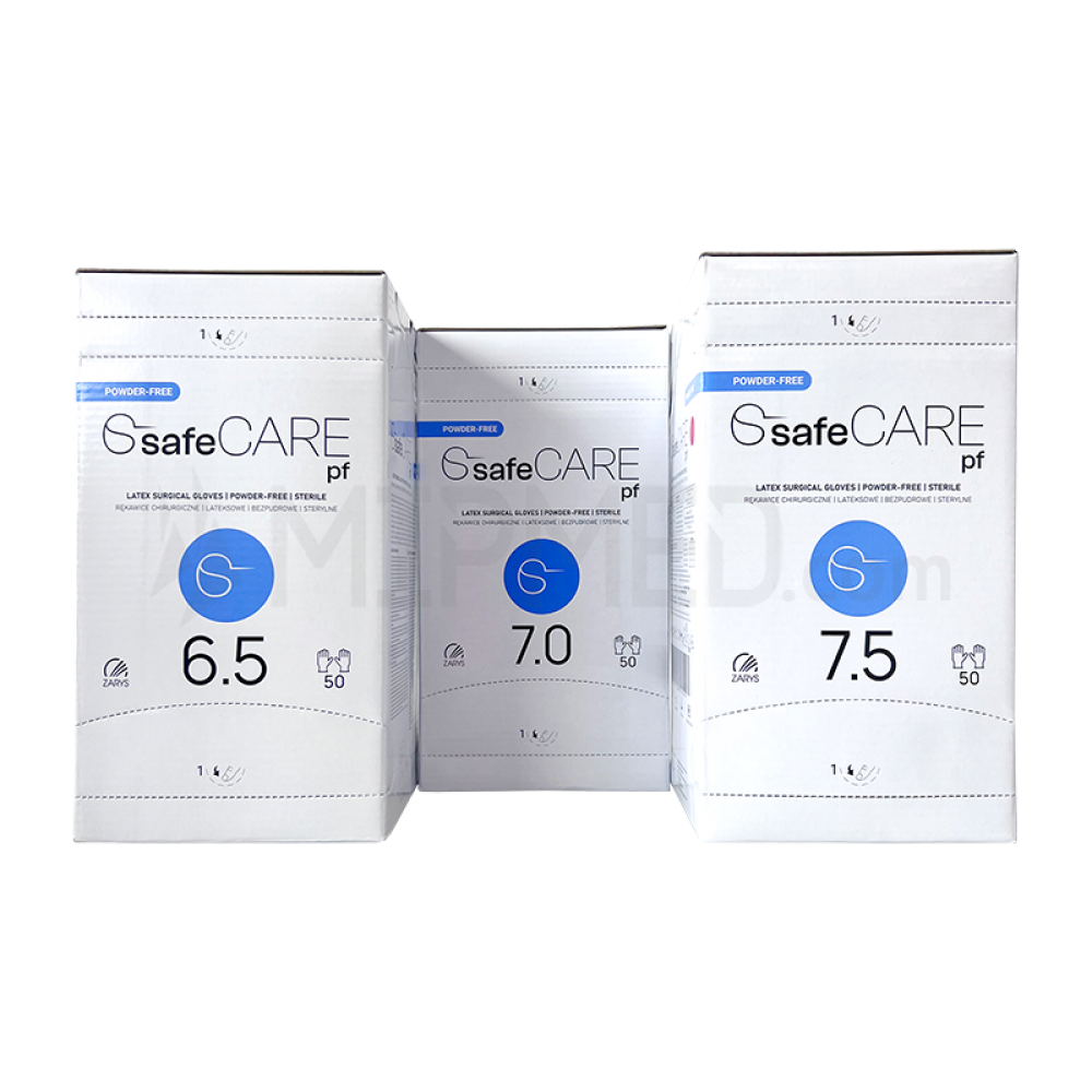 Embalagens brancas de luvas SafeCARE pf em três tamanhos distintas