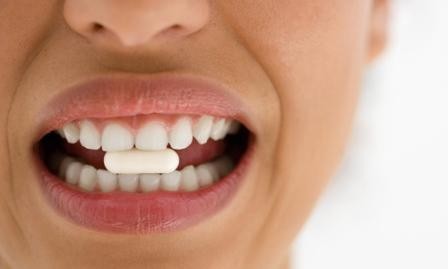 Boca com comprimido branco entre os dentes