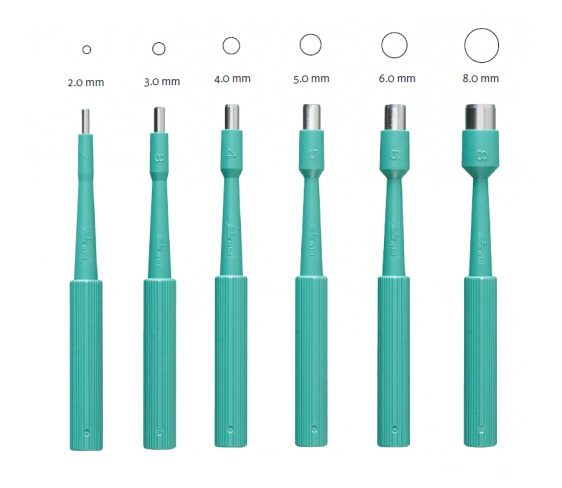 Os punções de biópsia são embalados individualmente em blisters estéreis. São codificados por cores e os tamanhos estão marcados em cada punção para facilitar a identificação. Proporcionam uma amostra limpa e precisa para um diagnóstico exato.