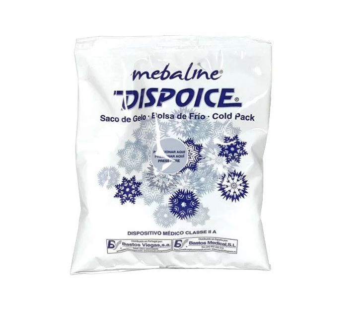 Embalagem branca de saco de gelo Mebaline Dispoice com flocos de neve azuis e cinzentos