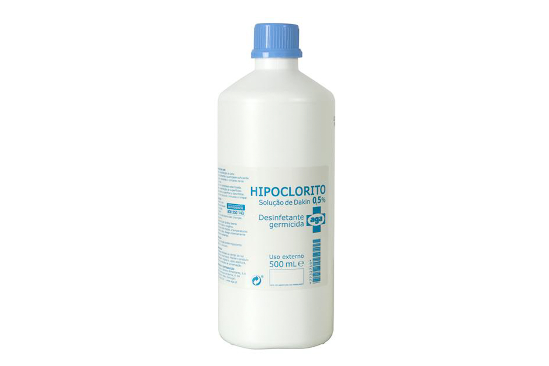 Frasco plástico branco com tampa azul de hipoclorito 6%, 500 ml, rótulo azul