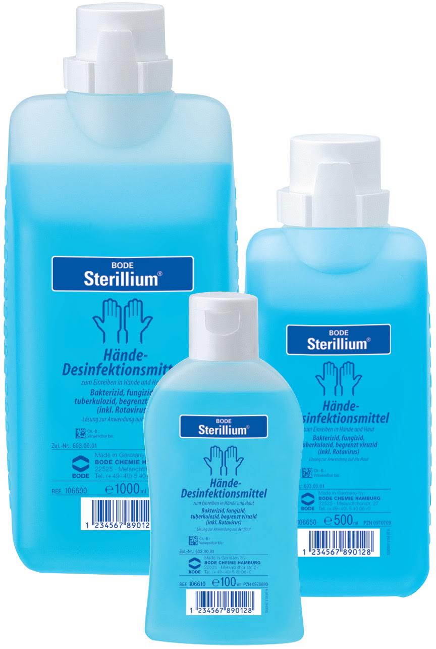 Frascos azuis de desinfetante para mãos BODE Sterillium