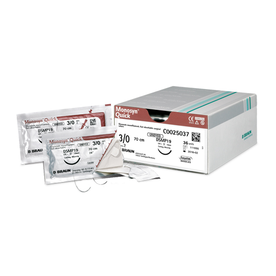 Monosyn Quick é uma sutura de monofilamento sintético absorvível a curto prazo, não tingida, feita de gliconato para a aproximação de tecidos moles com um processo de cicatrização rápido. É recomendada para todos os tecidos moles com um processo de cicatrização rápido.
