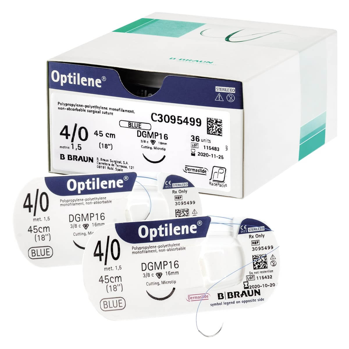 Optilene está disponível em apresentações de embalagens RacePack e LongPack para reduzir o efeito de memória. Outras apresentações especiais, incluindo pledgets PremiPatch PTFE, também estão disponíveis.