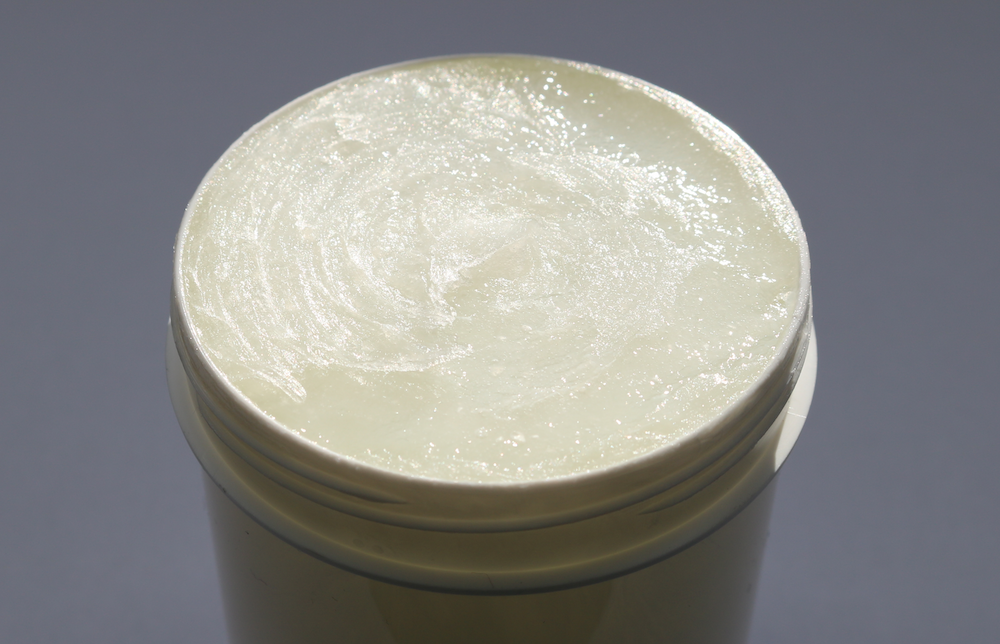 Frasco aberto de creme branco com textura suave e brilhante